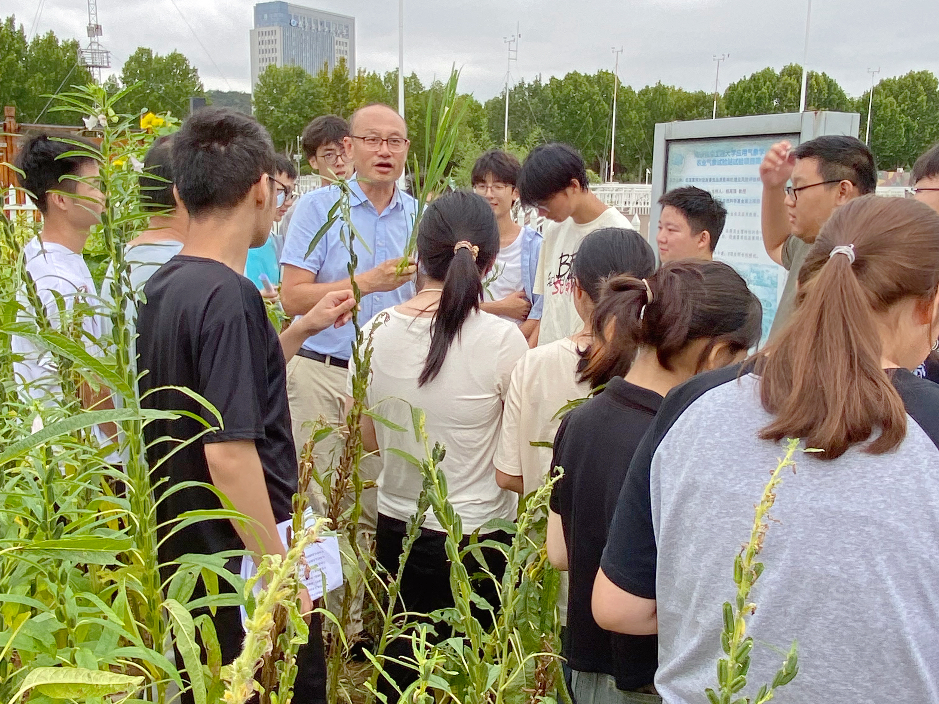 9月9日,南京信息工程大学生态与应用气象学院智慧农业学子迎来了一场别开生面的开学第一课。当天,智慧农业系系主任江晓东老师将课堂从教室搬到了“二十四节气农耕文化园”中的作物标本园,让学生在田间地头感受农业科学的魅力。江老师带领同学们认识各种作物,观察其特征和生长状况,并结合今年的气候特征,讲解不同作物如何受气象条件的影响。在棉花植株前,一名学生兴奋地说:“我知道为什么新疆棉花质量好了!因为那里光照时间长、昼夜温差大!” “可是每年天气都不一样,怎么让作物年年都高产呢?”一位同学又提出了新的问题,现场教学引发了同学们的热烈讨论和深入思考。