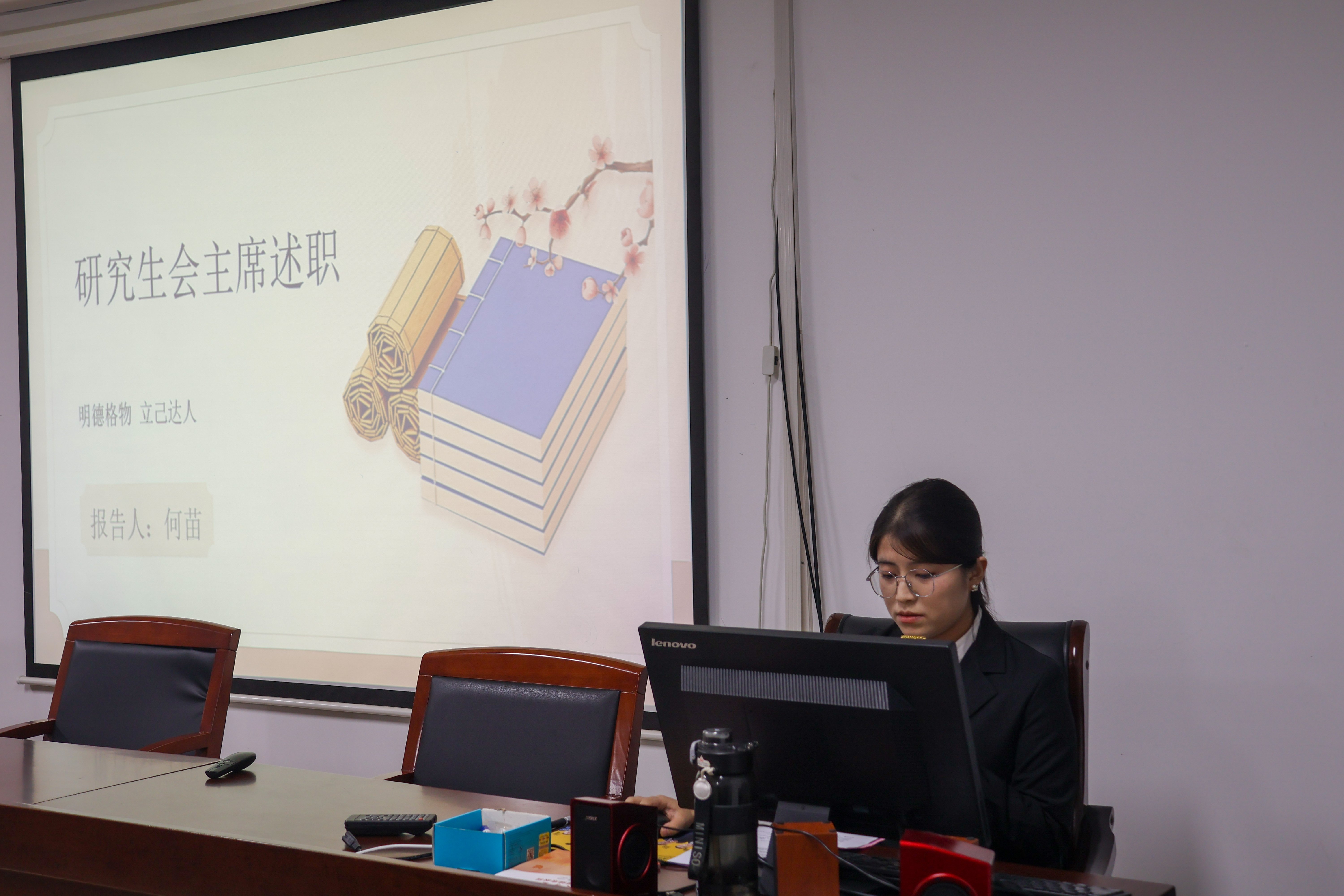 研究生会主席何苗作工作汇报,她从价值引领、科研解压、文化赋能、融合破冰四个方面回顾工作,同时直面问题,指出部门协同、就业助力、学术支持及创新性等方面存在不足。针对未来团学工作,她表示要加强团队建设、强化学术与就业支持、推动活动品牌化,为同学们提供更多助力。