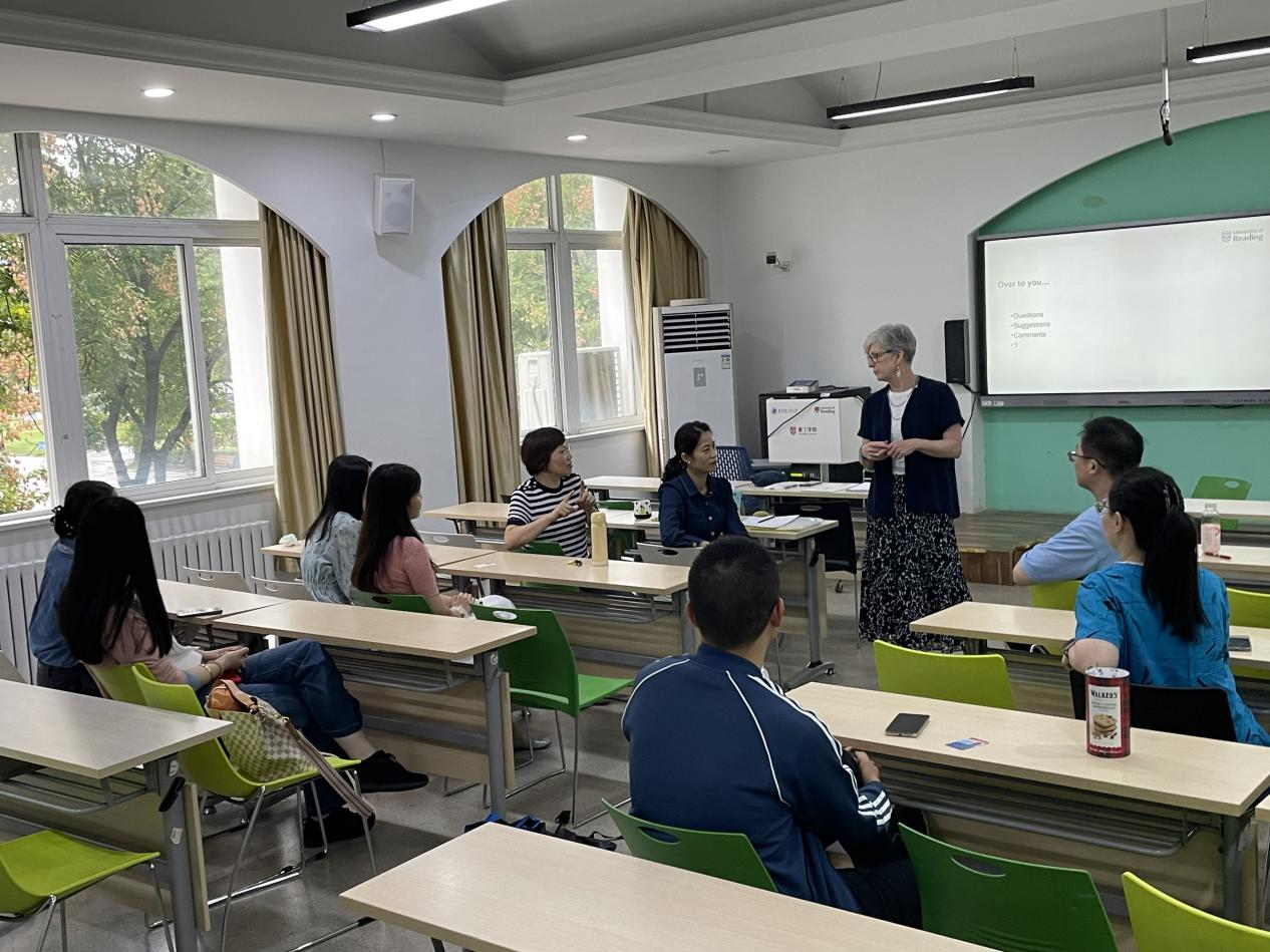 Liz简要总结了雷丁学院2024-2025学年Teep考试成绩,充分肯定了全体英语教师对学生英语能力提升起到的重要作用,并介绍2025-2026学年通用学术英语课程教学目标优化与教学评估改动的目的和初步方案,对来访期间的教学观察做出细致的反馈。