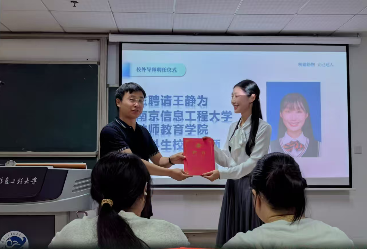 活动伊始,胡冉杰老师代表学院,向学院优秀毕业生王静颁发教师教育学院学生就业能力提升导师聘书。