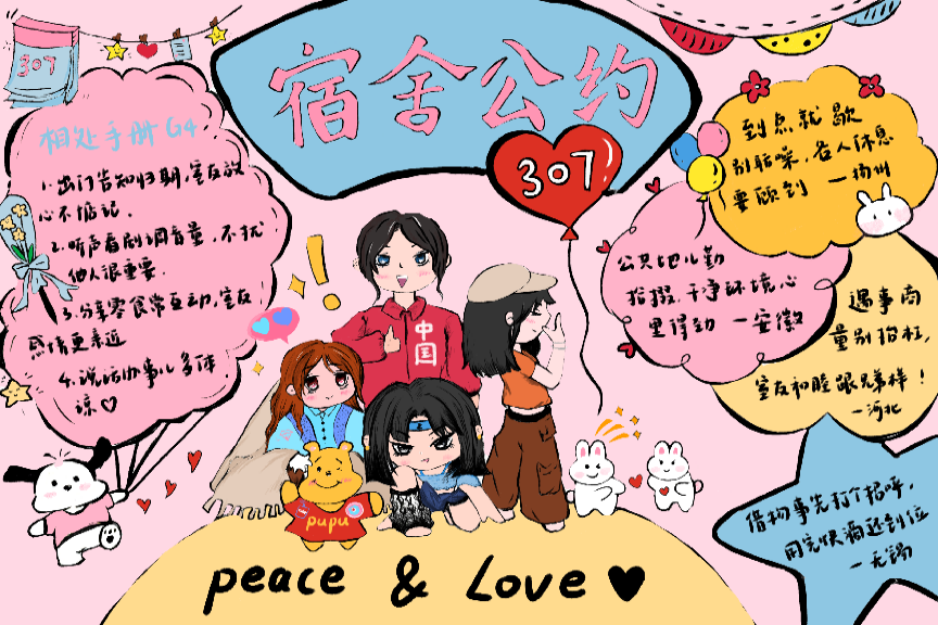 活动自发布以来,得到了同学们的积极响应,吸引了近20间宿舍积极参与。提交的公约作品内容既贴合宿舍生活实际,又充满了青春活力与创意巧思,充分展现了同学们对营造美好宿舍生活的热忱和用心。经过评委评审,结合宿舍公约的科学性、实用性、创意性以及实际践行效果,最终评选出一等奖1名、二等奖2名、三等奖3名、优秀奖6名。
