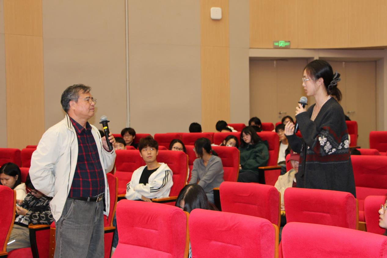 在互动交流环节,同学们踊跃提问,气氛热烈。面对“大学生如何培养和体现跨界思维”之问,杨文丰教授深情回顾在母校的学习岁月,坦言正是母校兼容并蓄的学术氛围,滋养了他跨学科的视野与勇气,并勉励学子勇于探索学科融合之路。当被问及“如何理解大自然”时,他以数学“极限”为喻,巧妙联结理工思维与文学表达,诠释生态写作中既求真又重个性的精神追求。围绕“中国自然生态文学如何向外推广”,杨教授分享了“天人和美”的理念,进一步阐释了中国传统生态智慧中人与自然和谐共生的思想底蕴,体现出母校育人理念中一以贯之的文化自信与生态情怀。