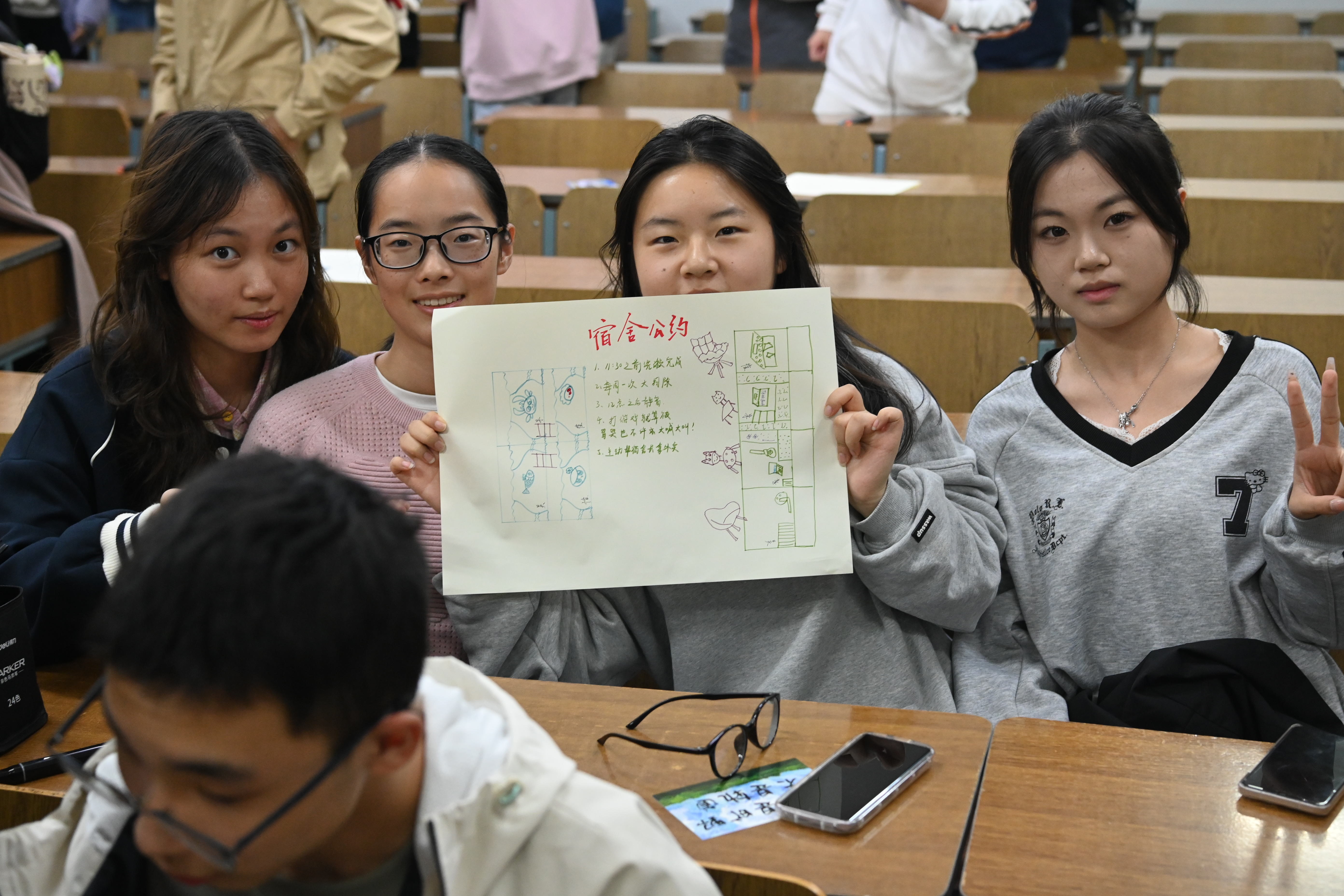 10月中旬至下旬,在驻心助行工作室的指导下,15位副班主任面向各自带领的班级陆续开展新生团辅。由于有了前期的模拟活动,副班主任更加娴熟地带领班级完成一个个活动任务:首先以“按手印” 方式签订团体契约,用一份郑重的承诺开启了这场破冰之旅;在“相似圈”活动中,随着 “第一次住校”“加入了学生组织”“尝试过3个食堂” 等描述的呈现,越来越多同学走进圆圈中心,陌生感在微笑与击掌中悄悄消散;而“趣味自我介绍环节”让大家在轻松互动中快速记住彼此,大家认真的倾听、真诚的回应,每一份心情都被看见;“入学小瞬间” 分享环节使得同学们敞开心扉,归属感在交流中悄然滋生;最热闹的 “建立宿舍公约” 环节中,同学们按宿舍分组,在宿舍示意图上标注自己的位置,共同绘制理想宿舍蓝图。“周日至周四晚11点熄灯”“轮流打扫卫生” 等具体条款,让宿舍生活更有秩序。最后的花式握手承诺与合影,让“宿舍小家”的凝聚力瞬间拉满。
