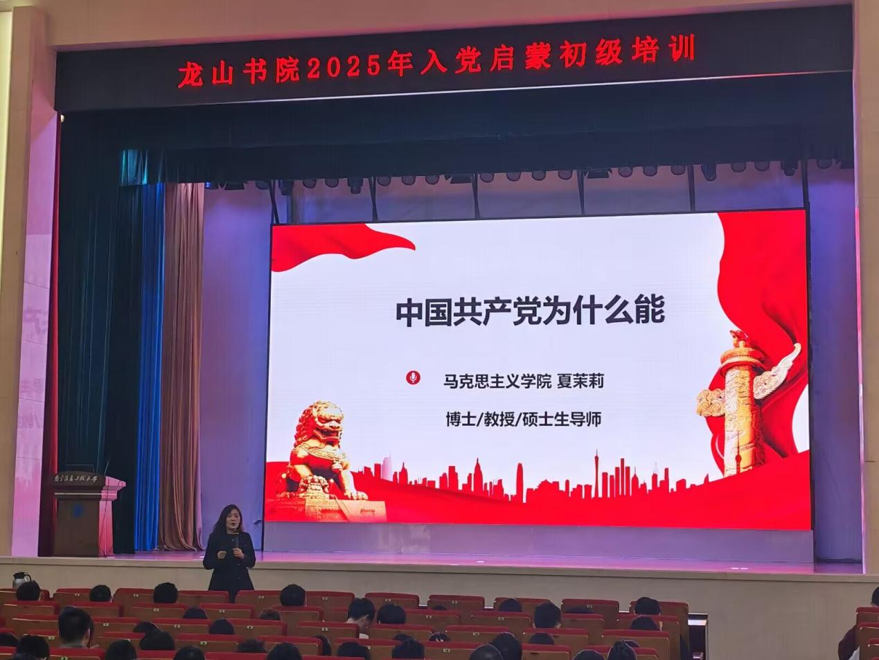 为了深化龙山学子对中国共产党的发展历程的认识,提升同学们的思想觉悟,龙山书院于11月5日在风云剧场举行了2025级入党启蒙培训。本次讲座特邀马克思主义学院夏茉莉教授主讲“中国共产党为什么能”,龙山书院分团委书记王永鹏就发展党员流程与要求进行了详细解读,书院2025级全体学生参加本次讲座。