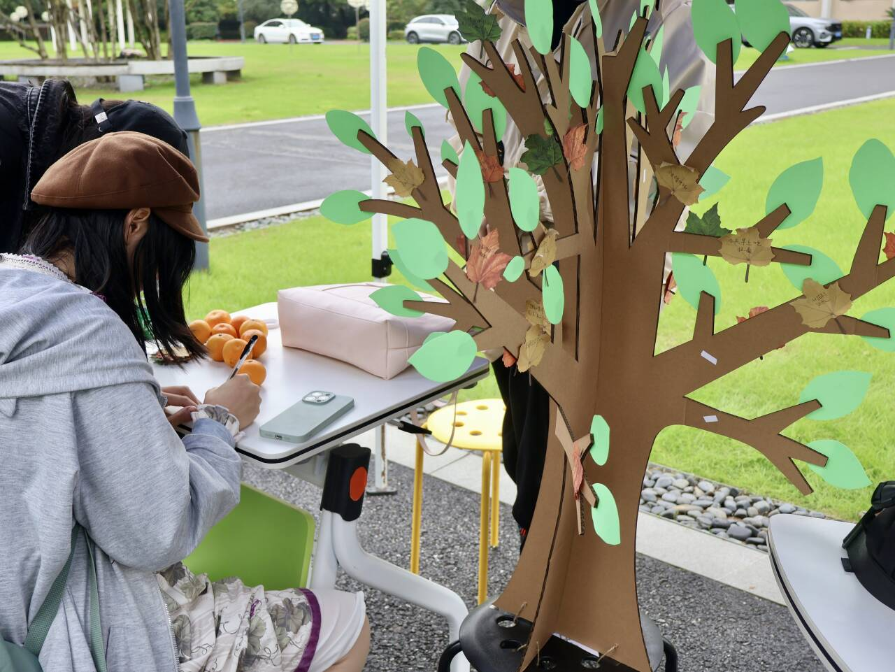 活动现场设有三个特色区域:“共绘心灵树”“情绪歌词盲盒”和“捕捉感动泡泡”。在“共绘心灵树”区域,同学们在枫叶状的便利贴上写下近期的感受、烦恼等,借此洞察心灵,梳理情绪;“情绪歌词盲盒”区域则鼓励大家在彩纸上写下契合心情或喜爱的歌词,在释放情绪的同时,也获得了一份自我安抚的宁静;而“捕捉感动泡泡”区域趣味十足,参与者用丙烯笔在黑色卡纸上记录感动瞬间,绘制个性涂鸦,最后将作品悬挂展示,在分享中传递温暖、感受美好。整场活动氛围轻松愉快,同学们在欢声笑语中收获了心灵的放松与共鸣。