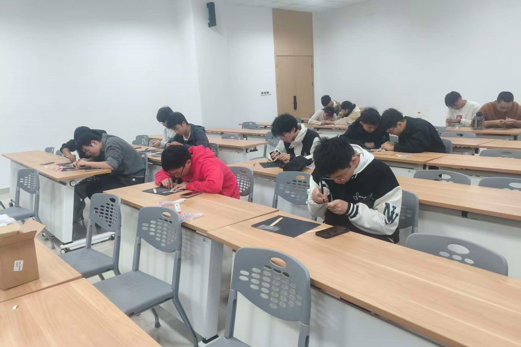 活动伊始,工作人员提前精心准备了充足的飞机制作材料,包括不同规格的卡纸、弹射装置组件、木板等,并通过生动的讲解和演示,详细讲解制作要点与安全规范,确保每位选手清晰了解比赛流程和注意事项。选手们听完讲解后,迅速投入创作,他们充分发挥想象力与动手能力,有的选手参考了真实飞机的气动布局进行设计,有的则大胆创新,尝试独特的机翼形状和机身结构。在裁剪、折叠、组装等步骤中,大家时而专注思考,时而相互交流技巧,将平面材料逐步转化为造型各异的弹射飞机,现场氛围专注而热烈,充满了科创的活力。