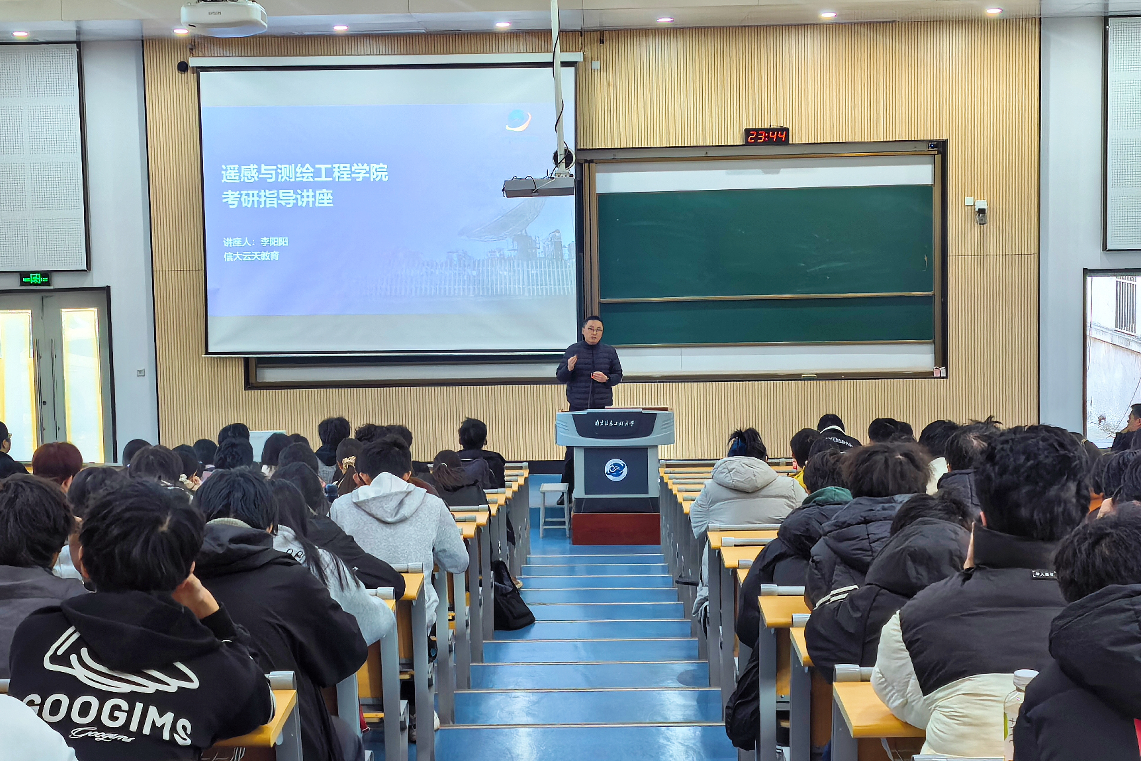 信大云天教育负责人李阳阳老师面向全体同学作考研指导。李老师首先结合行业动态,分析了遥测院相关专业广阔就业前景,激发了同学们的深造热情。接着,他系统梳理了研究生考试的基本知识点与宏观形势,并通过对近年分数线、我院考研数据的精准分析,为同学们提供了极具参考价值的报考定位指导。他表示,成功“上岸”离不开三大关键点:有效的信息搜集、科学的备考方案以及坚持不懈的拼搏精神。内容丰富、逻辑清晰的分享赢得了同学们的阵阵掌声。