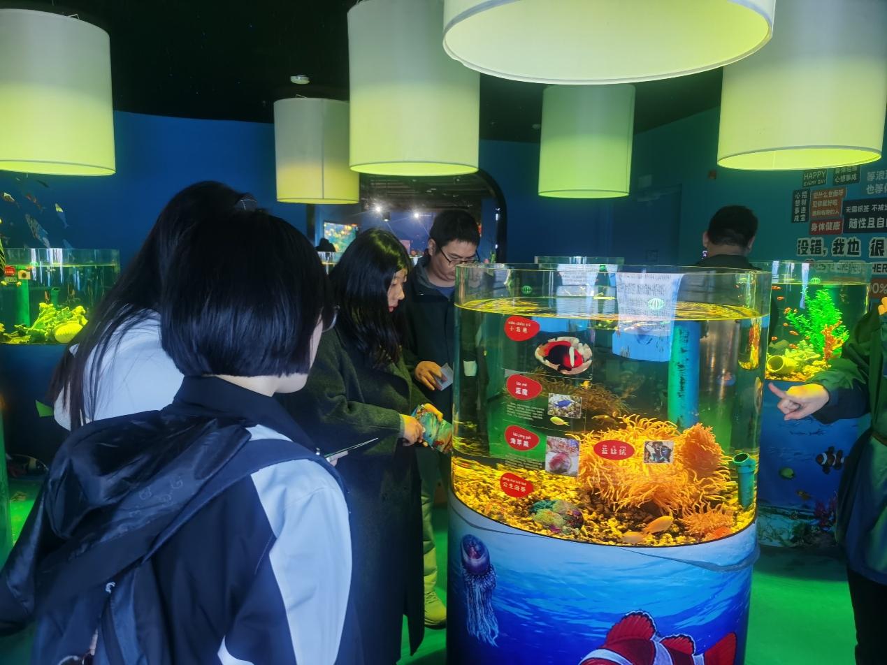 南京海昌海洋探索馆以“感知海洋、利用海洋、保护海洋”为核心理念,设有极地冰雪、炫彩海洋、生态海岸等八大主题展区,通过半开放式互动展示、科普讲解、特色表演等多元形式,打造了集科普教育、互动体验于一体的海洋探索平台。活动中,支部党员在讲解员的引导下,依次穿梭于各个展区:近距离观察珊瑚礁生态系统与珍稀鱼类的共生关系,了解海洋生物多样性保护的紧迫性;学习水母生存习性与海洋环境变化的关联,深化对海洋生态脆弱性的认知;在互动触摸池,党员们亲手触碰海星等海洋生物,真切体会 “人与自然和谐共生” 的深刻内涵。