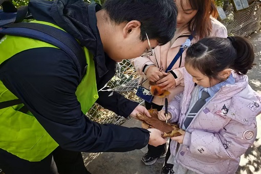 同时,志愿者们手持工具分组行动,协助清洁园区卫生。步道旁的落叶、草丛里的零食袋、石缝中的塑料瓶等,都被志愿者们一一“收入囊中”,并严格按照垃圾分类标准投放到对应垃圾桶,用双手为小动物们打造干净整洁的家园。