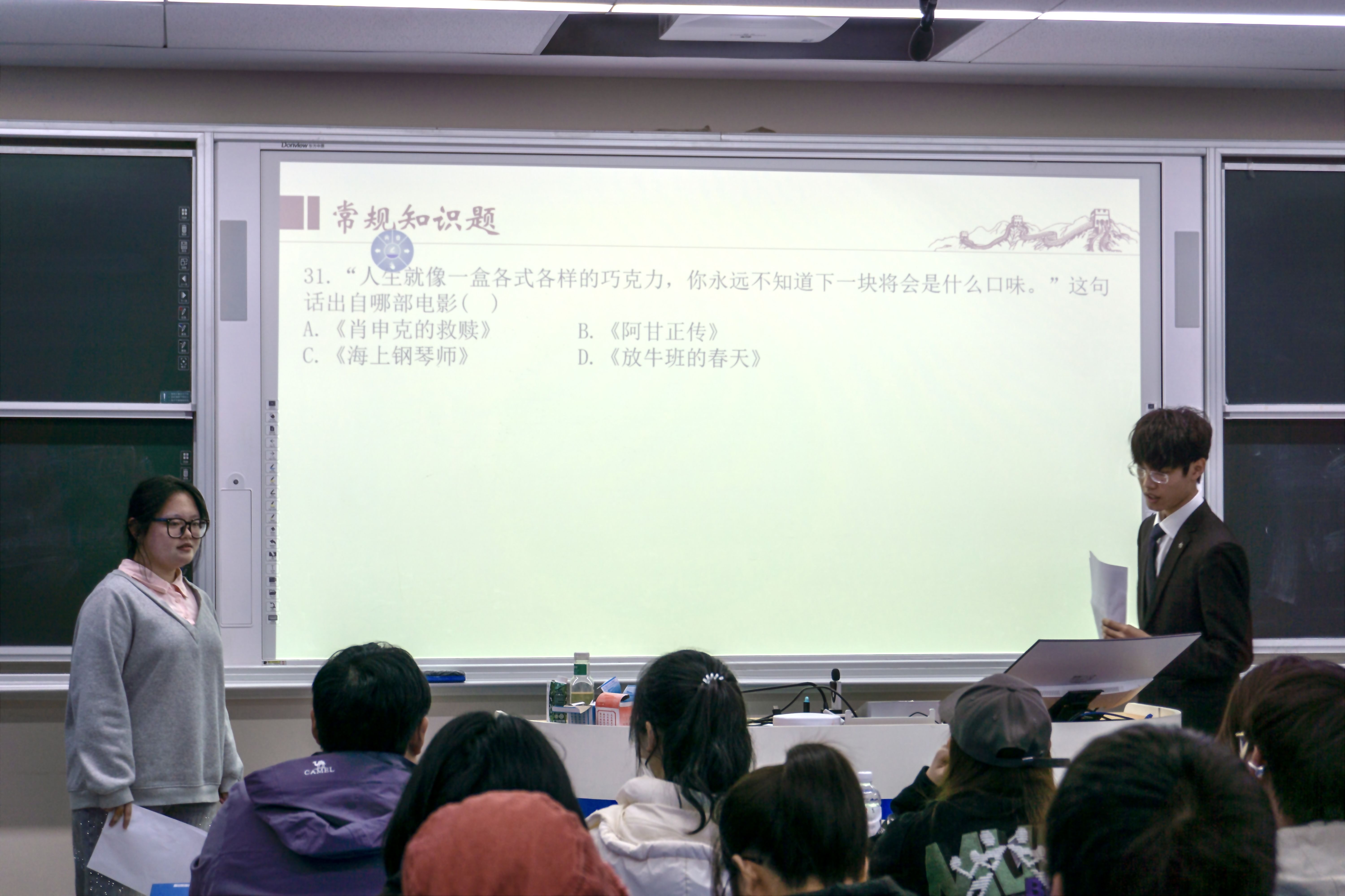 知识竞答环节以“艺术鉴赏与审美认知”为主要内容,设置电影美学常识、镜头语言鉴赏、经典作品审美四类题型,覆盖影片构图、色彩运用、叙事美学等核心美育知识点。参赛同学两两组队,在小组赛与决赛的激烈角逐中,精准解读电影艺术的审美逻辑,展现了扎实的美育知识储备与敏锐的艺术感知力。集体观影环节精选经典影片《疯狂的石头》,让同学们在沉浸式体验中聚焦艺术鉴赏与审美提升。大家专注感受影片独特的叙事节奏、精巧的镜头语言与鲜明的视觉风格,从情节编排中品味叙事艺术的审美张力,从镜头调度中体悟导演的创作巧思,在沉浸式体验中锤炼审美判断力与艺术鉴赏力。