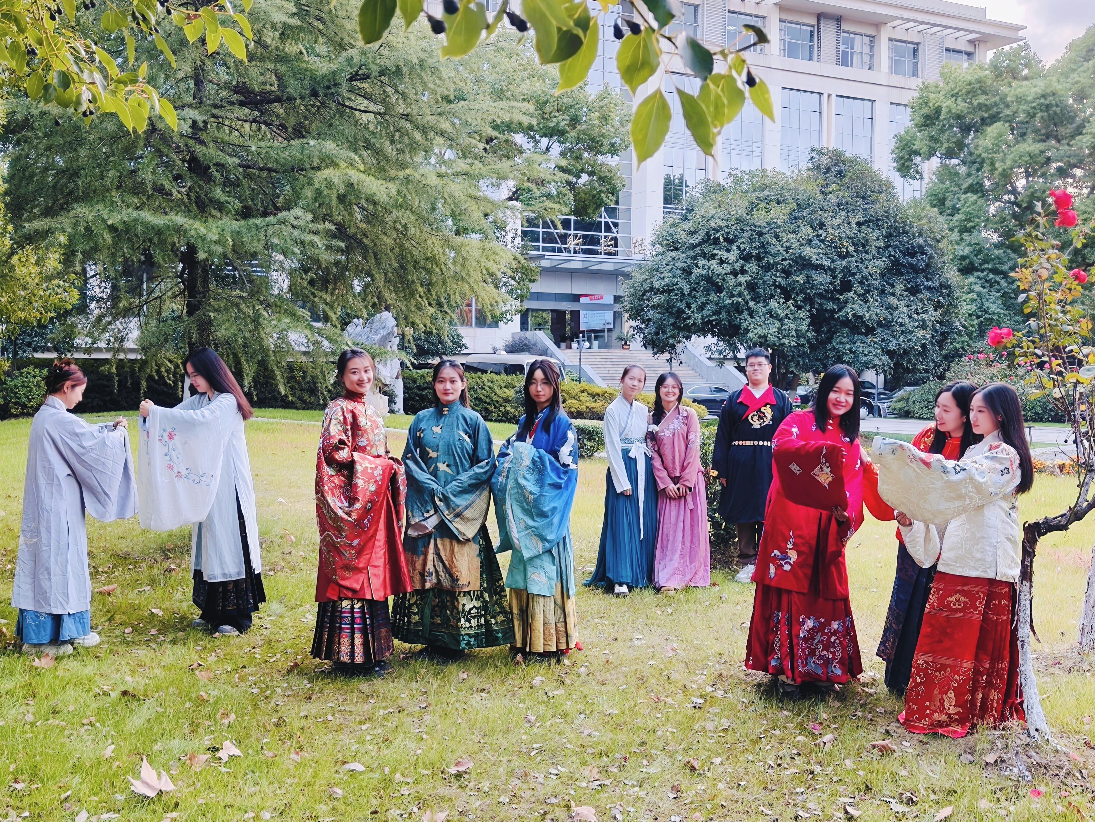 活动伊始,何培老师为同学们讲解了中国传统服饰的历史脉络与文化内涵,并演示了不同朝代服饰的穿着礼仪。在老师的指导下,同学们亲手尝试穿戴汉、唐、明等时期的典雅服饰,在系带整冠之间真切感受华夏衣冠的仪度与底蕴。随后,大家共同学习了揖礼、叉手礼、万福礼等传统相见礼,在一躬身、一敛袖之中,体会古礼的优雅与静心之力。活动尾声,师生身着华服漫步校园,以镜头记录下一幕幕古今交融的诗意画面,也将从容与专注凝聚于光影之中。参与学生深受触动,纷纷表示:“当我们身着汉服,在镜头前行礼时,仿佛真切触碰到传统文化的温度,在服饰与礼仪中完成了一次身心共鸣的穿越,学业压力也随之一扫而空。”