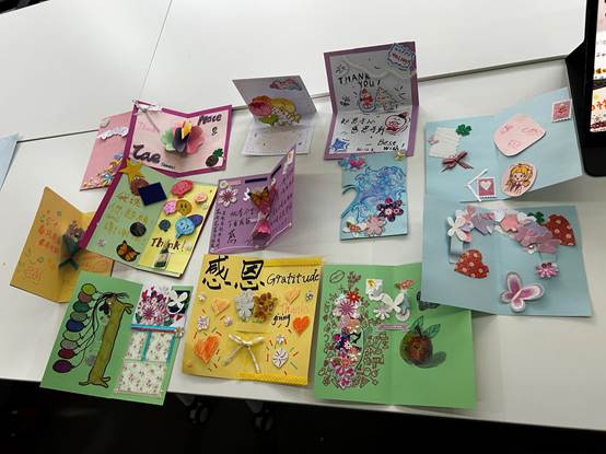 现场创作环节中,学子们迅速投入状态,党建园地内安静有序,只偶尔传来画笔划过纸张的细微声响与材料裁剪的轻响。有的学子以细腻的彩铅勾勒出与家人相处的温馨瞬间,还有的通过立体折叠工艺,将对同学的陪伴情谊定格在贺卡之中。每位学子都专注于笔尖,将心底最真挚的情感,转化为一幅幅兼具艺术美感与情感温度的作品,字里行间、一笔一画都承载着对家人、老师、同学乃至生活的感恩之心。