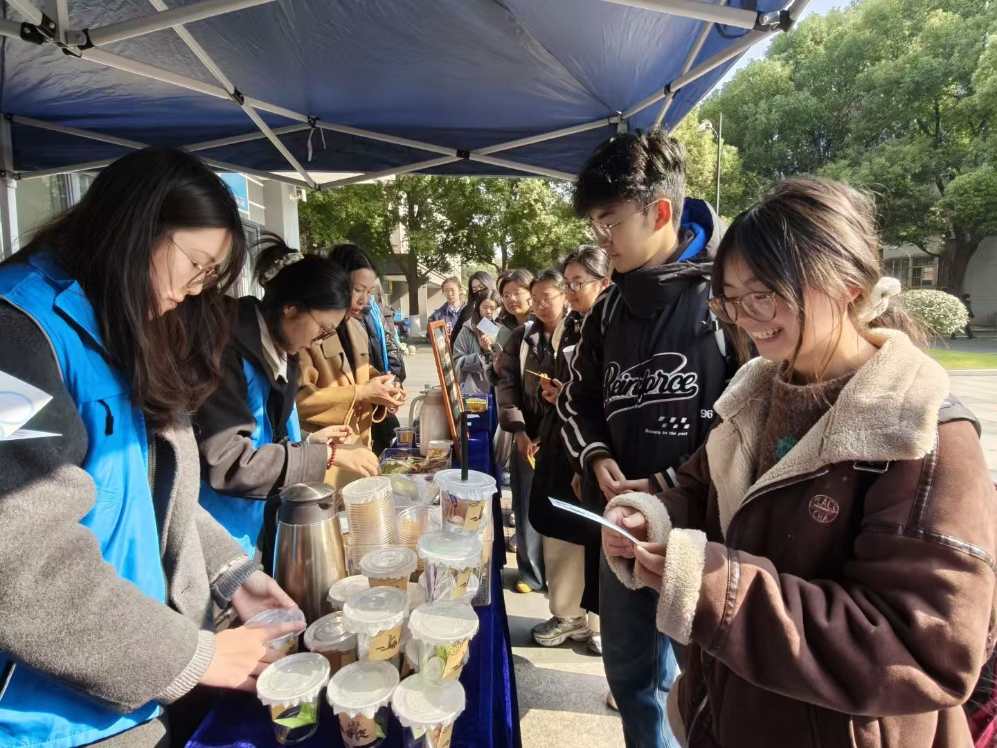 本次游园会精心设置了五个特色主题摊位,打造了丰富多元的互动体验:“上岸茶水铺”中,学子们亲手冲泡咖啡、奶茶等“上岸”特饮,领取“元气上岸”贴纸蓄力;“压力释放站”前,大家将烦恼压力写在收集卡上投入碎纸机,让焦虑随纸屑消散,收获“轻装前行”贴纸再出发;“灵感杂物社”内,彩色词语碎片铺满桌面,经学子巧手拼贴,化作暖心专属诗句,获赠“妙笔生花”贴纸助力考场发挥;“巧手包粽坊”借“包粽”谐音“包中”的美好寓意,吸引学子们用彩纸、丝线制作祈福粽,收获“一举高中”贴纸获满满祝福;“幸运抽签屋”里,定制书签上写满学弟学妹暖心祝福话语,让抽到好运的学子欢呼不已,集齐“好运加持”贴纸后,游园会顺利通关并领取考研助力加油包。
