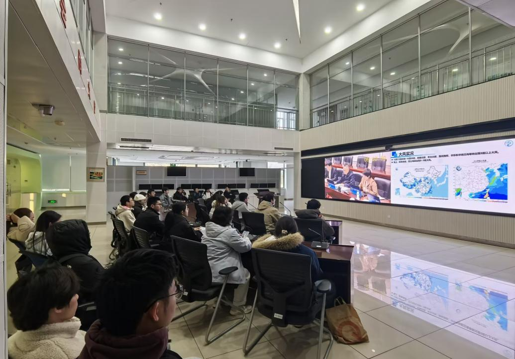 会商现场气氛庄重、流程严谨。电子大屏实时呈现卫星云图、雷达回波、地面观测等多元数据。来自全国各地的预报员围绕近期天气形势展开细致分析,交流预报思路与依据,最后由中央气象台专家总结提炼。同学们全程认真聆听,观摩业务人员从监测分析到预报决策的完整过程,切身感受气象工作的科学严谨与责任担当。