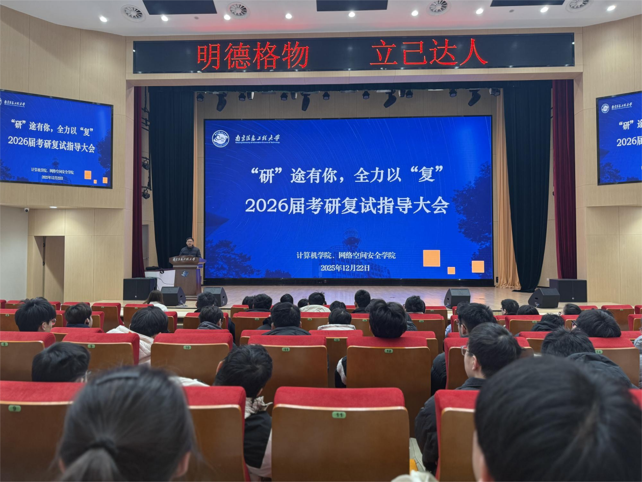 为切实帮助2026届考研学子明晰复试流程、掌握调剂策略、拓宽多元发展路径,12月22日,计算机学院、网络空间安全学院于临江楼报告厅成功举办“‘研’途有你,全力以‘复’”考研复试调剂指导大会。学院党委副书记、副院长朱文镇,毕业班辅导员及2026届考研学生参会,会议由相晨主持。