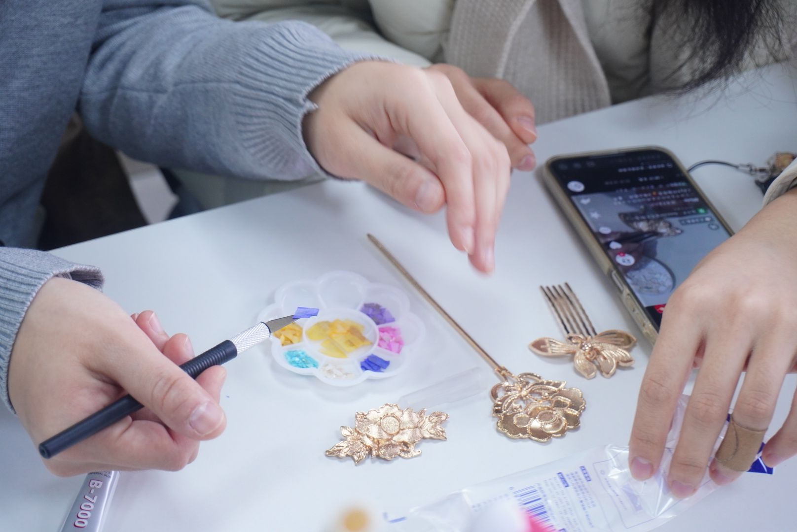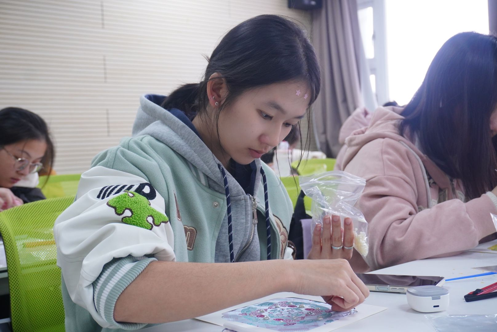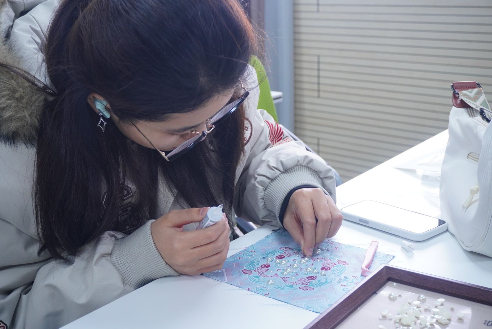 珍珠画体验区则洋溢着浪漫的新年气息。大家将一颗颗圆润的珍珠精心排列,拼贴出绽放的烟花、吉祥的福字等元旦意象。烟花转瞬即逝,但亲手制作的珍珠烟花画能定格美好,就像对新年的期许永远热烈。从构图设计到固定粘贴,师生们在耐心雕琢中赋予珍珠新的生命力,一幅幅璀璨夺目的珍珠画,既饱含传统美学韵味,又彰显着青春创意。