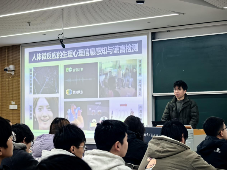 郑文明还特别说明了多模态生理心理情感信号,向同学们普及了什么是中枢神经生理信号,并揭示了可穿戴计算机“信号获取——情感识别——情感合成”的“测谎”流程,通俗易懂的讲解在拓宽在场学生知识面的同时,也大大激发了同学们的求知欲,更专注地投入到讲座中。