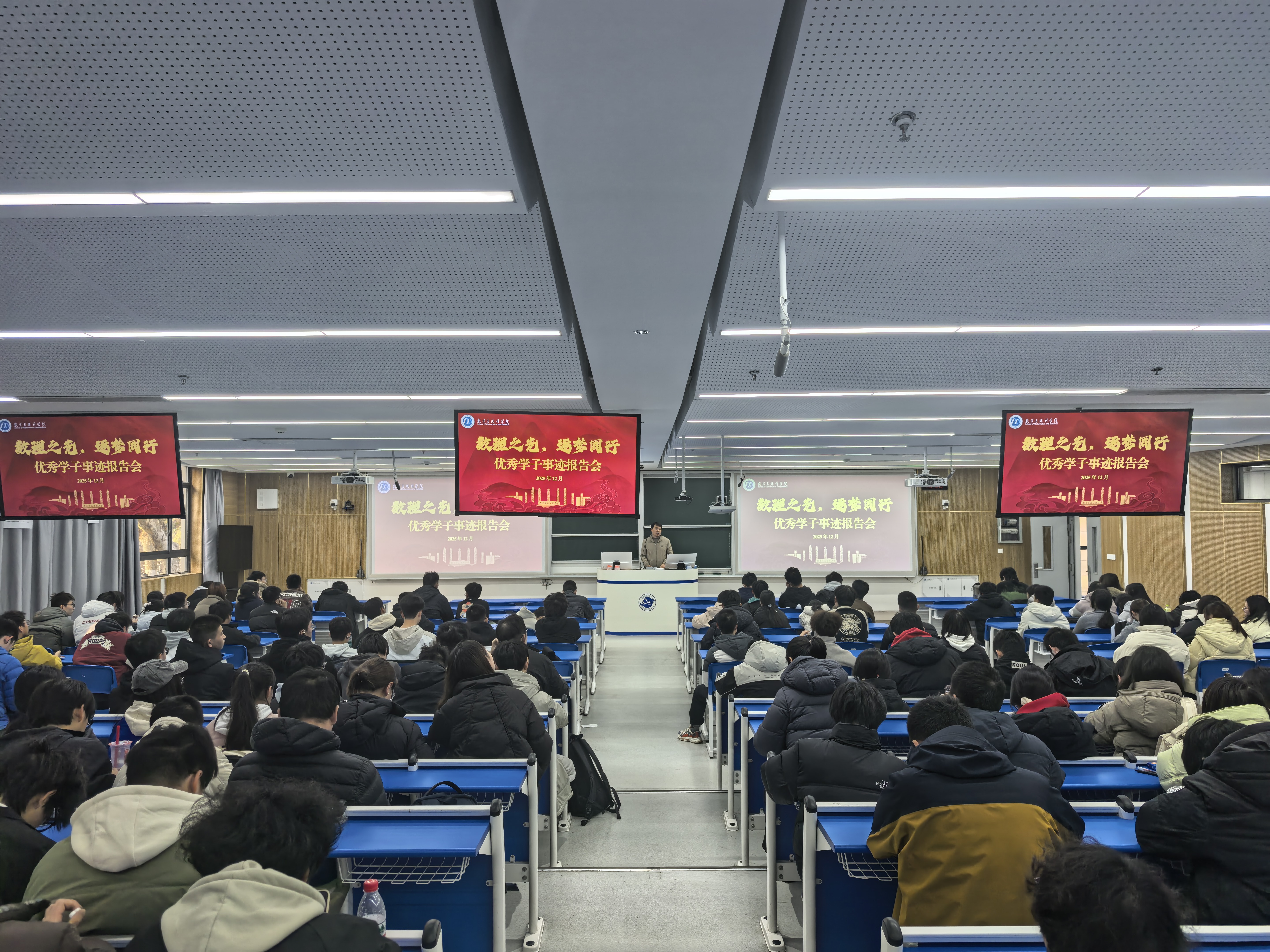 为充分发挥优秀学生的示范引领作用,提升奖助政策的育人价值,帮助学生明晰学业发展方向、规划大学生涯,近日,数学与统计学院在明德楼N115举办优秀学子事迹报告会。本次报告会由辅导员邵福生主持,全体2025级本科生参加,四位分别斩获国家奖学金、校长奖学金、国家励志奖学金的优秀学子代表分享成长故事与经验。