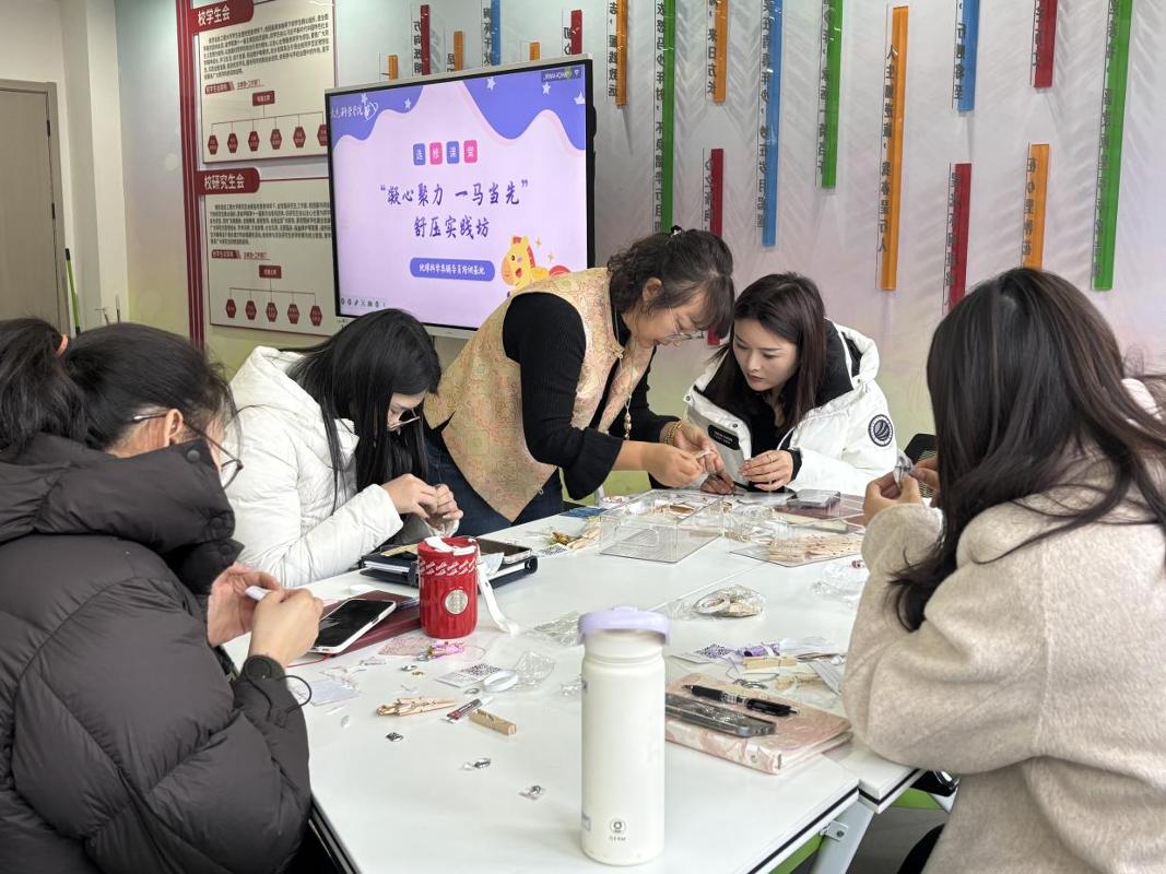 李艳艳介绍了本次舒压实践坊的举办初衷,希望通过本次兼具文化底蕴与动手乐趣的实践活动,为辅导员们搭建一个放松身心、交流互动的平台,以更饱满的热情投入后续工作。随后,刘伟为大家讲解宋锦的历史文化内涵、制作工艺特点以及手工挂件的制作步骤。辅导员们按照指导老师讲解的步骤,先精准裁剪宋锦布料,再仔细粘贴到金属基底上,最后有条不紊地进行配件组装。现场氛围轻松融洽,欢声笑语与专注讨论交织不断。辅导员们将压力融入指尖的创作中,制作出一个个造型可爱、做工精致的宋锦小马挂饰。