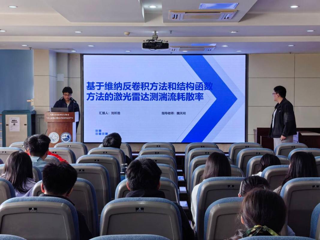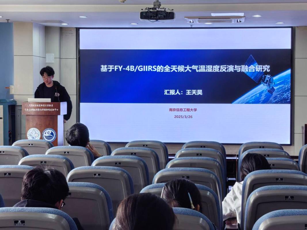 本次报告会中,刘圻浩同学和王天昊同学依次汇报了近期的科研成果。刘圻浩以“基于维纳反卷积方法和结构函数方法的激光雷达测湍流耗散率”为题,介绍了利用相干多普勒测风激光雷达(CDL)进行湍流测量的研究。他提出通过维纳反卷积方法还原被压缩的空间风速信息,并结合K41理论的结构函数来计算湍流耗散率。研究不仅验证了该结构在不稳定层结下与MO相似理论垂直演化规律的一致性,还详细排查了因建筑物遮挡等因素引起的异常数据。刘圻浩表示,由于维纳反卷积存在边缘效应,未来计划尝试引入神经网络反卷积等方法,并运用ACF外推法进一步剔除噪声影响。王天昊以“基于FY4B/GIIRS的全天候大气温湿度反演与融合研究”为题,详细展示了其团队针对国家气象中心业务化算法需求所做的工作。他利用风云四号B星的高光谱数据,通过BP神经网络建立了“前七天训练、第八天输出”的实时滚动建模反演系统,并采用最优插值(OI)和一维变分模型将反演结果与CMA预报数据进行了深度融合。研究结果显示,经过该模型反演与融合后的大气温湿度廓线,其均方根误差(RMSE)较现有的卫星二级产品有了显著降低,部分指标优化达30%至70%以上,有效提升了数据的精度与可用性。