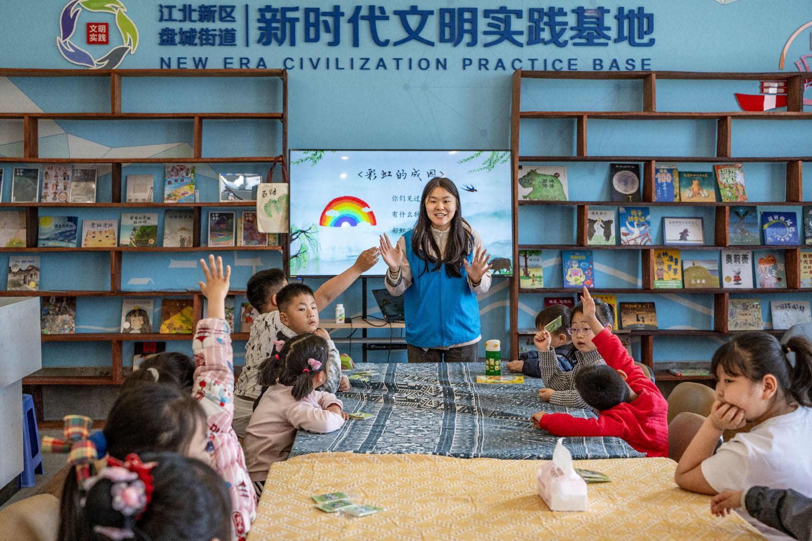 活动伊始,志愿者用生动有趣的语言向小朋友们介绍了清明节气的物候变化、气候特点与传统习俗。从“清明时节雨纷纷”的气候现象,到踏青、插柳、荡秋千等传统习俗,志愿者深入浅出地讲解,让小朋友们对清明节气有了更深入的了解。随后,志愿者结合清明时节“虹始见”的自然现象,为小朋友们讲解了彩虹形成的科学原理。互动环节,小朋友们踊跃回答问题,现场气氛热烈。