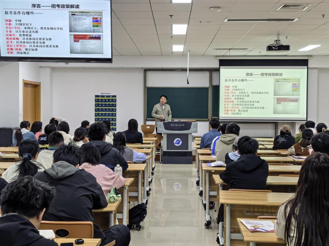 考公考编专场聚焦政策解读与高效备考。专家老师系统讲解了国考、省考、选调生政策差异及选岗技巧,通过翔实数据分析了各岗位的分数分布,勉励同学们锚定目标、冲刺高分,并结合商科专业背景与就业方向,提供了针对性的填报策略。2026届学生樊榕从自身备考经历出发,分享了分阶段备考的具体方法,介绍了应届生身份在各类考试中的相关优势,梳理了从备考规划、资料选择到考前冲刺的核心要点。