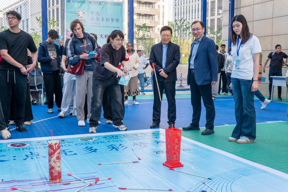 本次活动紧扣中文学习与文化体验,精心设计了丰富多元的互动环节,兼具知识性、趣味性与参与性。汉字配对、文字拼图等游戏巩固汉字知识、感受汉字结构之妙;传统投壶、夹乒乓球、踢毽子、丢沙包等休闲项目考验动手能力与协作默契。作为活动的亮点环节,DIY花灯制作深受国际学生喜爱。在志愿者的细致讲解与耐心指导下,同学们充分发挥创意,用多彩画笔在月球灯上勾勒图案、用汉字书写祝福,巧用塑料瓶、精美贴纸等材料制作特色灯笼,并将亲手拓印出的“梦想”装进台灯,将中文元素与创意设计融入其中。一盏盏独具匠心、饱含心意的花灯次第点亮,既展现了国际学生的动手巧思,也传递出中式灯艺的独特韵味。最后,中外学生共同放飞了满载梦想的彩色纸飞机,象征着青年一代以中文为桥、让梦想跨越山海,携手飞向更广阔的未来。