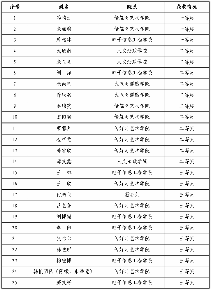 近日,2020年南京信息工程大学校园廉洁文化作品评审结果揭晓,全校共评选出一等奖6项、二等奖15项、三等奖20项,合计41项。滨江学院提交的作品获得一等奖3项、二等奖11项、三等奖11项,共25个奖项,获奖层次和数量在全校各单位中遥遥领先。学院荣获“优秀组织奖”。