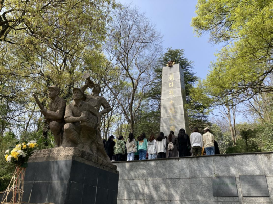 随后,大家怀着崇敬肃穆的心情来到位于南京市老山脚下的浦口区烈士纪念碑前开展清明祭扫主题党日活动。烈士纪念碑在蓝天白云的映衬下巍峨屹立,格外庄严肃穆。支部学生党员们在纪念碑前整齐列队,祭扫活动在庄严的气氛中正式开始。