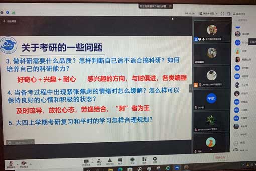本次学风建设主题班会,四位优秀校友各有侧重,通过自己的亲身经历帮助2019级全体同学进一步认识了自己所学的专业,坚定了学习信心、鼓舞了学习热情;为鼓励全体2019级同学积极备战考研、做好职业规划、进一步推动学院良好学风建设打下了坚实基础。