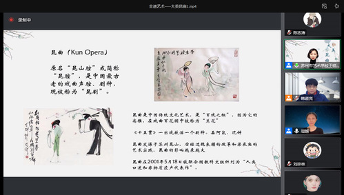 随后,王主任又向大家介绍了昆剧中的不同戏曲角色。通过不同角色的剧照分别讲解了“生旦净末丑”五角的妆容特征以及所代表的人物类型。为了使同学们能够更直观的认识不同角色,王主任以视频直播的形式带领大家参观了苏州市艺术学校的课堂,展现了学生们的学习生活,并由该校学生代表为同学们展示不同角色的表演形式及各角色的专业动作,使同学们对于昆曲和昆曲角色有了更为直观的认识。
