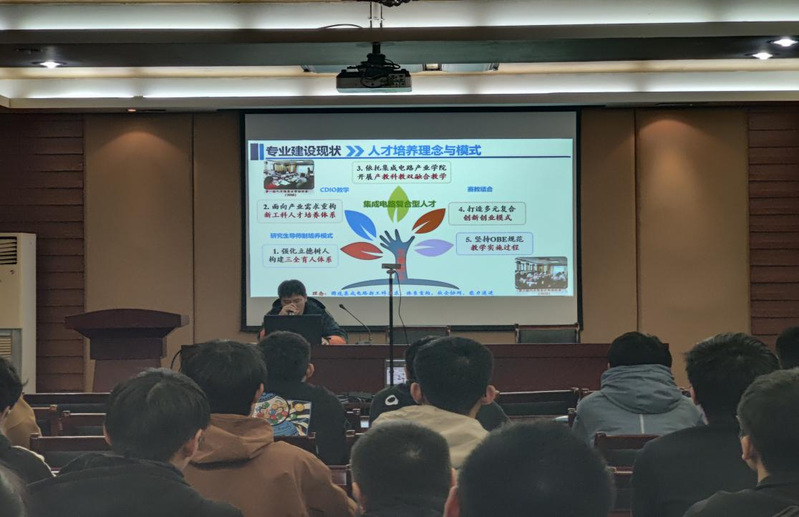 为引导大学生合理科学定位自身发展方向,充分认识自我,科学制定学习规划,了解所学课程体系与教学思路,增加班主任老师、导师对班级同学的了解,促进师生友好交流,11月17日下午,电信院22电信类1班在学科二号楼N201开展以“微电子科学与工程专业发展史”为主题的“导师(班主任)面对面”活动。活动采取线下参加、线上直播同时进行的形式,由班主任杨杰主讲,班长何子奇同学主持,22电信类1班全体同学及辅导员黄开洁老师线下参加,学院其他同学线上参与。