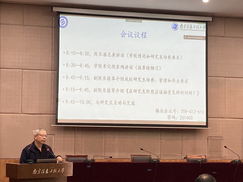 徐军就研究生培养方案及相关规定做了详细解读,并以“在研究生阶段应该接受怎样的训练?”为题,深入分析研究生在学习方法和学习目标上与本科生的不同,并总结在研究生阶段应该接受的训练。他勉励全体研究生要勇于创新,甘坐“冷板凳”,不断努力提升自己的综合能力。