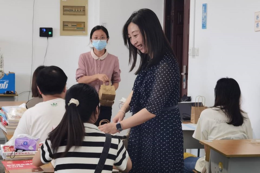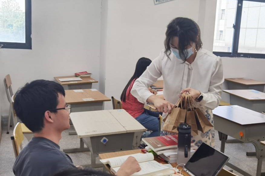 走访和慰问过程中,张皓非常关心同学们的复习进度和身心状态;她充分肯定了同学们为梦坚守、勤学不怠的态度,鼓励大家继续坚持,为自己的梦想努力拼搏,也建议同学们合理安排作息、保持良好心态、注意健康饮食,以最好的状态迎接研究生入学考试。同时,张皓表示,学院非常重视和支持大家考研,十分关注大家的考研动向,会一如既往地为同学们复习迎考做好服务和保障工作,希望大家能够脚踏实地、心无旁骛地复习备考并考取心仪的院校。最后,张皓副书记及辅导员为在场同学逐一送上了学院精心准备“橙”意满满的“福袋”,预祝大家在考研中能够乘风破浪,心想事“橙”。