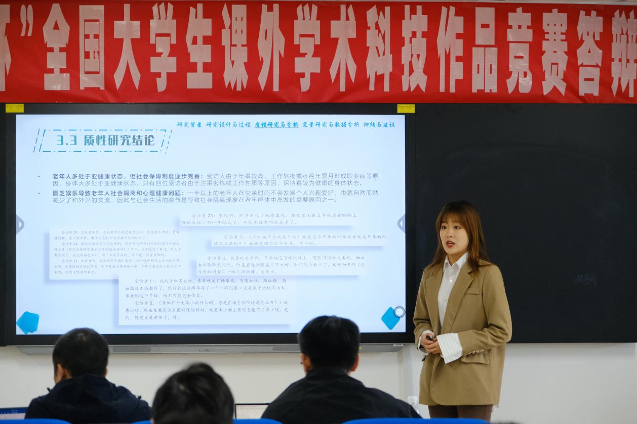 答辩现场,参赛团队依次派出代表上台展示作品,全体队员上台进行答辩。参赛团队借助PPT,对各自学术创新项目进行全面详细的展示,评委老师对参赛队伍作品也提出问题并给予相关修改建议。评委老师阐释了“挑战杯”赛事的要点,要紧跟时事热点,重点关注二十大报告中的精神内容;结合学校特色,强强联合,提高作品竞争力;强调学生深度参与,展示学生参与作品的过程。