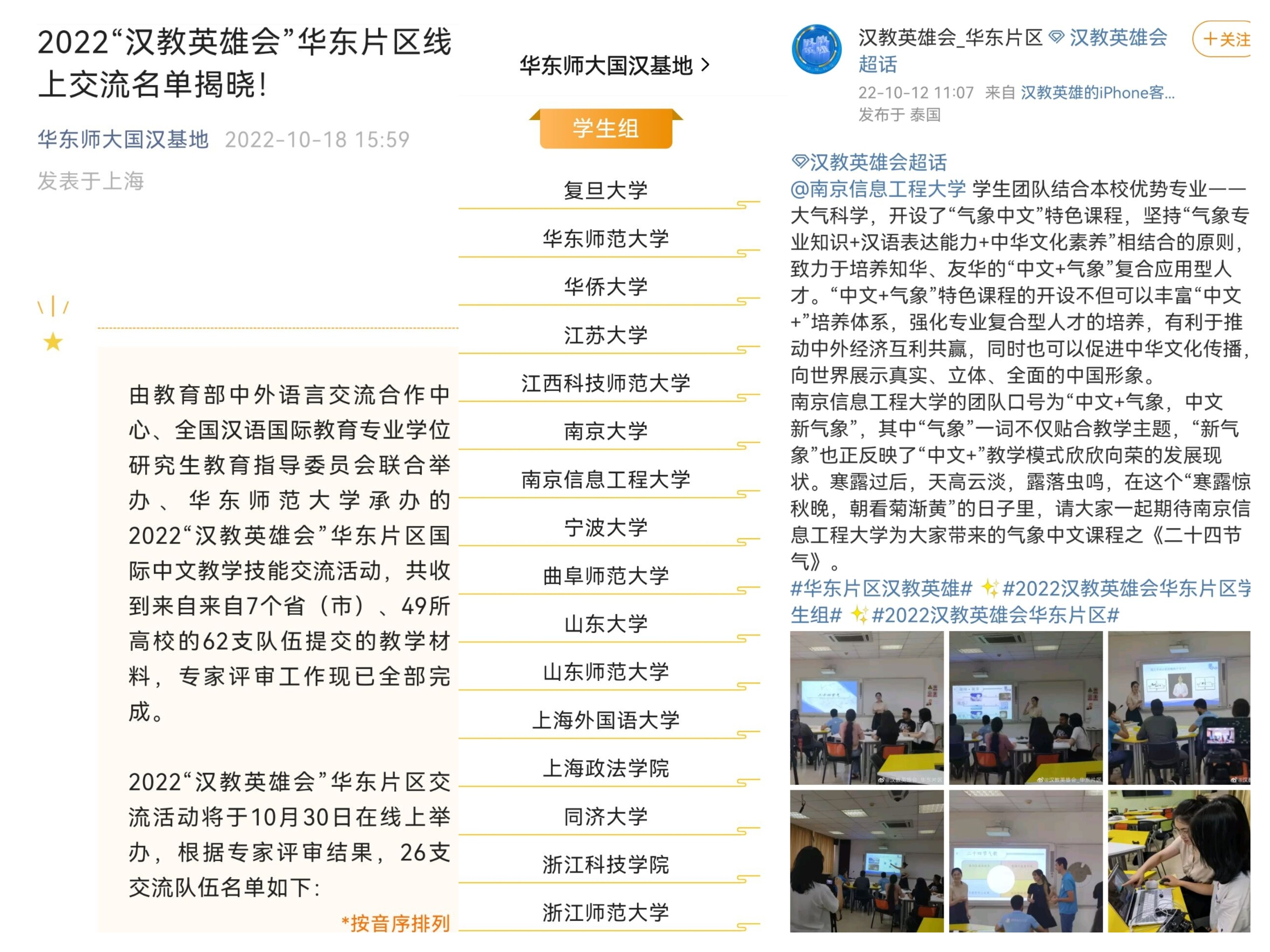 近日,教育部中外语言交流合作中心、全国汉语国际教育专业学位研究生教育指导委员会联合举办、华东师范大学承办的2022“汉教英雄会”华东片区国际中文教学技能交流活动,目前已完成专家评审工作。在7个省(市)、49所高校的62支队伍提交的教学材料中,我校文学院“中文+气象”主题课程脱颖而出,成功进入2022“汉教英雄会”华东片区交流活动阶段。