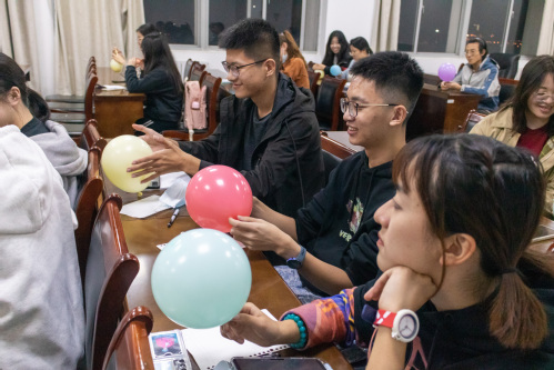 活动开始,秦老师首先引导同学们制作出自己的专属个性化名片,并向其他人开展自我介绍,让大家对彼此有了初步的了解,接着通过吹气球的小游戏,让大家对自身的压力状况进行了简单评估并依此分组。随后,由每一组中心理压力最大的成员进行陈述,其他成员从不同方面对他的情况作出反馈。最后,秦老师作总结指导,帮助其梳理原因和矛盾点,并提出相应的缓解方式。