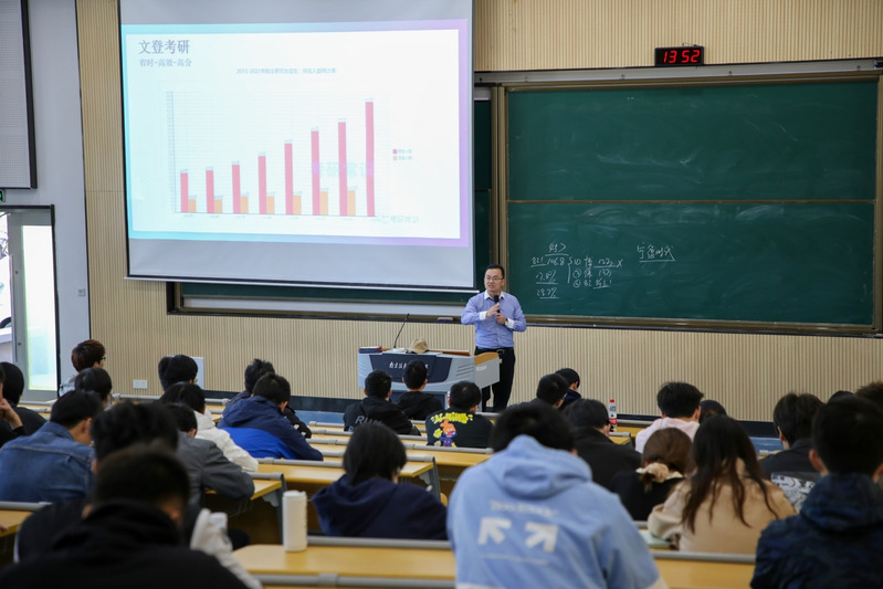 大会伊始,张伟用详实的数据分析了近年来本科生考研的形势及具体情况,建议同学们考研备考要做到知己知彼、目标明确,要多方面搜集考研数据,深入剖析目标大学的特点,多向学长学姐等请教备考方式方法。他还鼓励学生制定详细的考研计划,积极组建考研互助小组,不断提高考研信息共享和结对帮扶水平。
