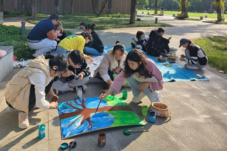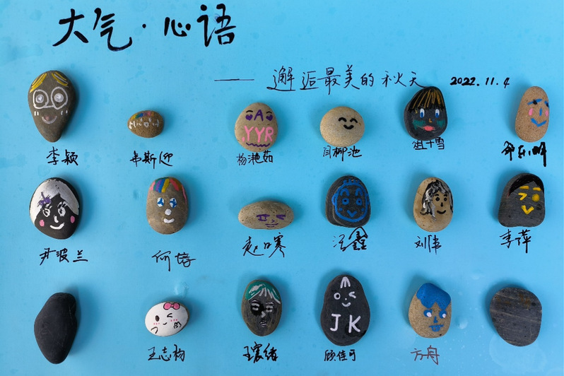 活动伊始,同学们首先用亲手绘制的石头头像作为特别的“签到表”进行签到。接着,刘老师带领大家漫步校园,通过在落叶上打孔来发现平时注意不到的美好景致。活动中,同学们欣赏到了独特的信大秋色,捡拾了许多花纹漂亮、颜色奇妙的落叶。随后,刘老师带领同学们开展树叶想象、树叶绘画、树叶吹泡泡等活动,在欢声笑语中,与秋色撞个满怀。