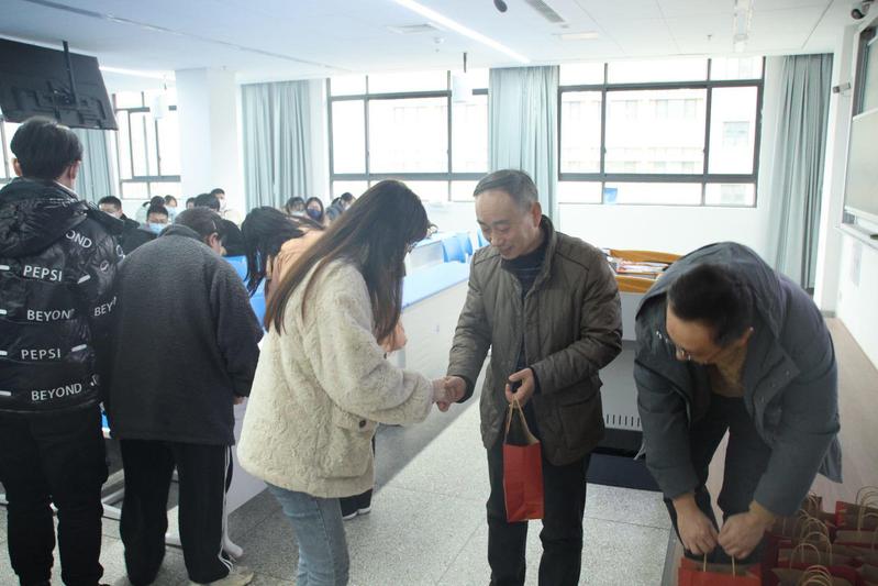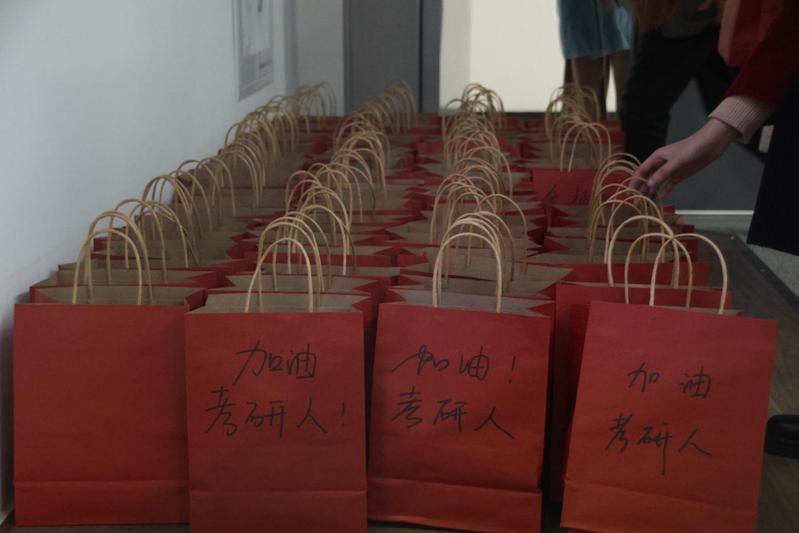 最后,老师们为每位考研的同学发放了考研慰问礼品,鼓励大家在最后阶段振作精神,努力冲刺,并预祝各位同学金榜题名,事如人愿。