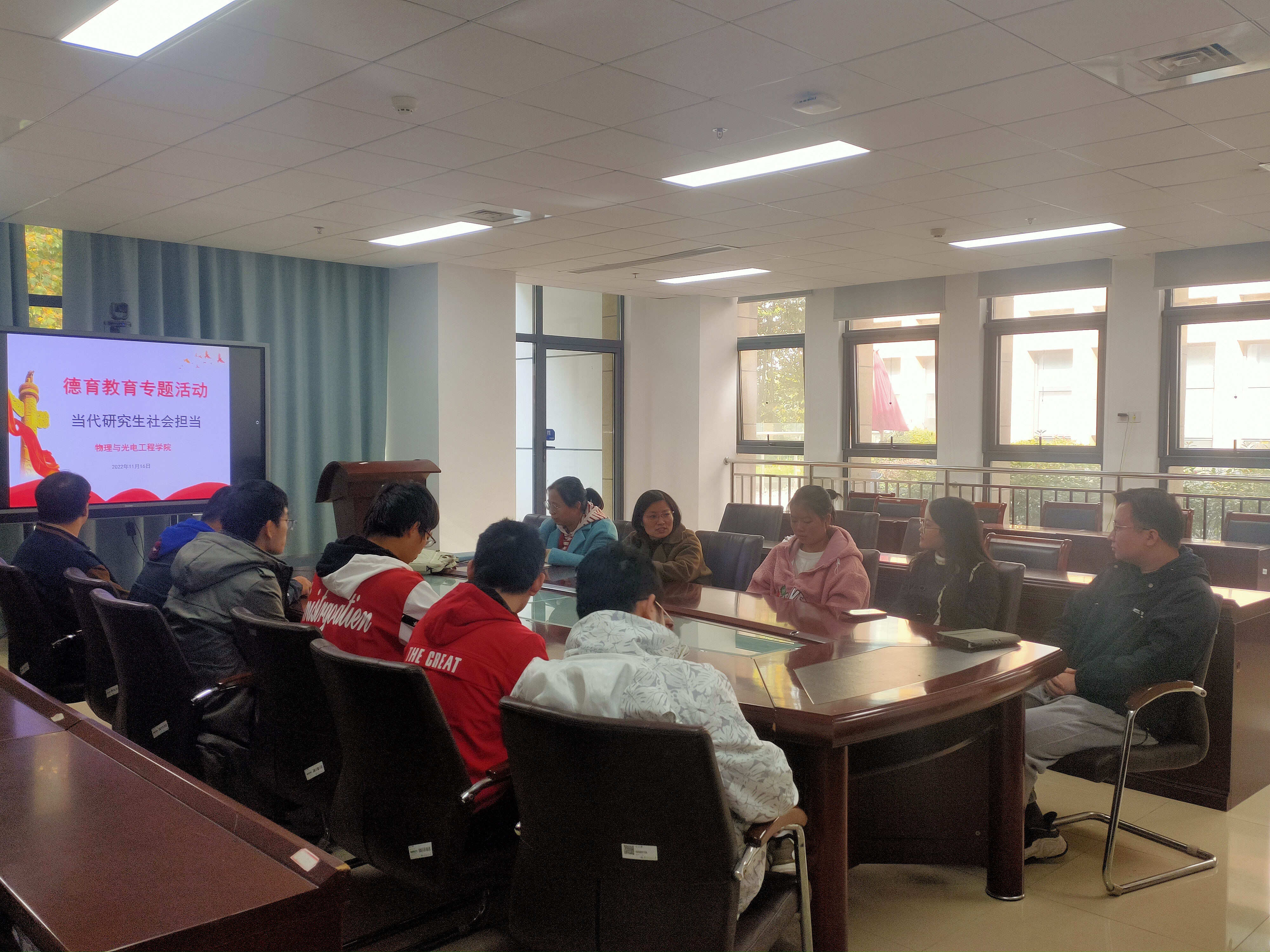 为进一步落实学校研究生德育辅导员工作制度,提升学院研究生思政教育工作实效,11月16日,物理与光电工程学院在藕舫楼330会议室召开研究生德育教育主题座谈会,师生热议“当代研究生社会担当”。学院2021级研究生德育辅导员杨翠红老师、助理德育辅导员陈云云老师及2021级全体研究生参加会议,畅谈体会。会议由研究生教务秘书张佳欣主持。