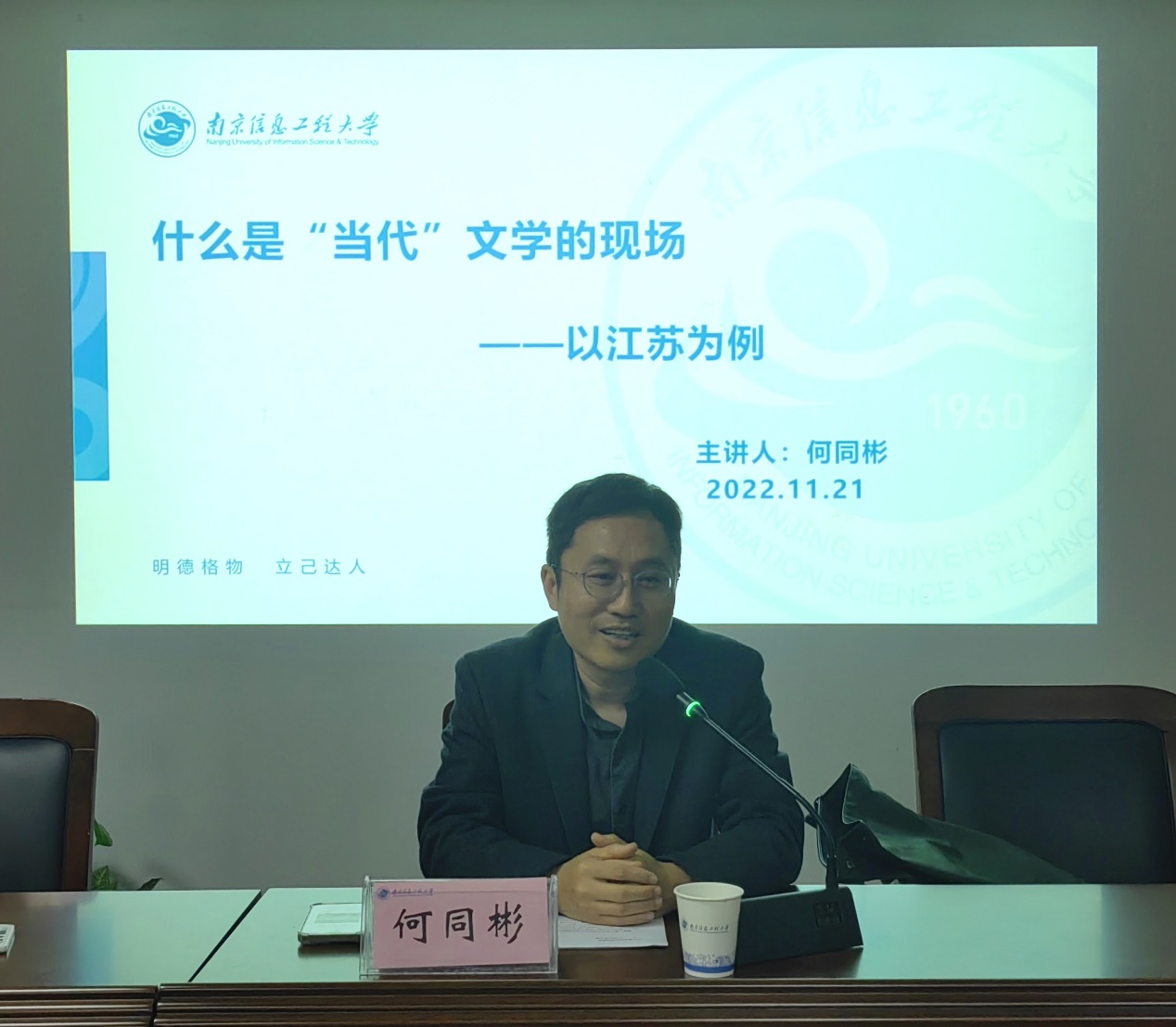 何同彬首先就当代文学空间无限、延展性强的特征,表明文学创作要基于严肃的研究立场介入文学现场,打开封闭系统,贴近真实生活。接着从五方面阐释当代文学现场的构成与要点:大学学院,即当代文学现场的重要组成部分,认识到学院提供的优势与局限性并寻求突破;作家协会,即中国文学体制下的宝贵产物,要坚定当代文学现场的意志性;各类民间组织与文学社团,贡献着论争;新媒体与网络文学,即当代文学中最重要的现象,在高科技新媒体影响下产生了人的新尺度;各大文学奖项与读书会,激励与诱导着文学现场的发展。何同彬认为文学观念远离文学现场必然会受牵制,认为对当代文学的理解不应该被困于陈旧观念之下,被框定在规定的美学范畴内,呼吁同学们要充分运用当代意识,切近潮流进行文学研究。