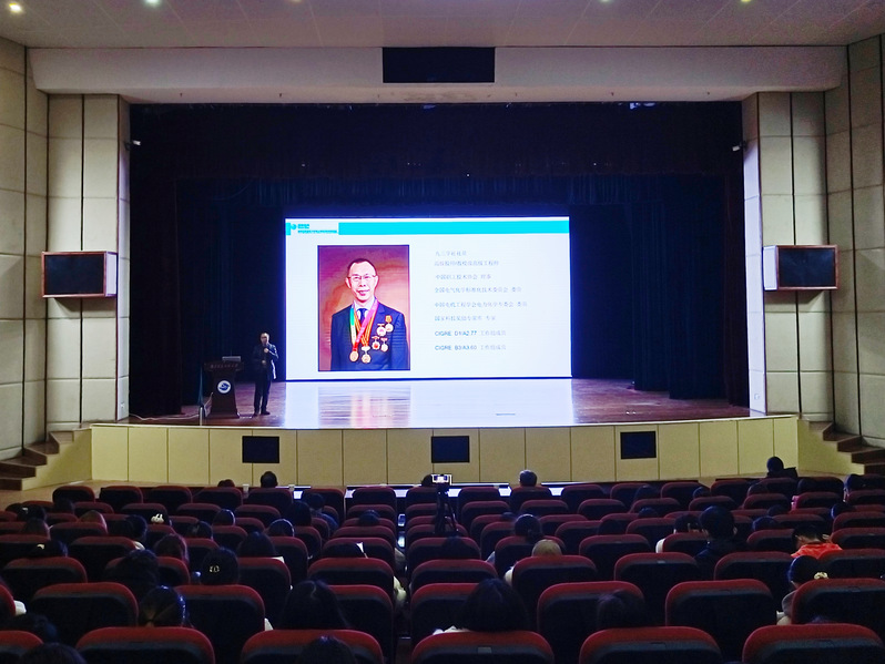 朱洪斌以“不放弃,必成功”为主题,向师生们分享了自身的成长经历、个人事迹、工作成果等,展示了“全国劳动模范”的风采。他讲述了自己作为一名非科班出身的“一线工人”,“误打误撞”进入江苏省电力试验研究所,从事电力用油气检测工作,最终成为了一名电力设备的“验血师”的故事。他为在场的师生展示了一张自己从2011年到2018年所获荣誉奖励的时间图标。他笑着对大家说:“也许有些人会认为我把自己的荣誉列在这里非常的显摆。但是大家有没有注意到我列的第一个荣誉获得的时间是2011年。从1988年入职到2011年,整整23年我才获得了人生第一个荣誉。而在此期间我连一个单位先进都没有拿过。这个图放在这里,我只是想告诉老师同学们四个字——厚积薄发。” 他指出,劳模精神的根本就是职业精神,要学会“不满现状”,不断进步,成功的“捷径”就是积微成著。他通过大量案例,以朴实的语言、真挚的情感,向师生们解读了劳模精神、工匠精神的内涵。朱洪斌还从“志向”“信念”与“行动”三个方面分享了“不放弃,必成功”的途径。他说,“志向”和“信念”源自国家和社会行业的需求,他结合“抓斗大王”包起帆和“铁人”王进喜的朴实事例,讲述了志向与信念如何促使他们立足平凡岗位推进了行业业务创新。他向大家“传授”了如何“行动”的法宝,一是要会自省,弥补自身不足;二是要自律,趁年轻奋发努力;三是常怀感恩,增强社会责任意识,以个人之力回报社会。最后,他再次强调:只要我们一直坚持不放弃,就一定能够收获成功!