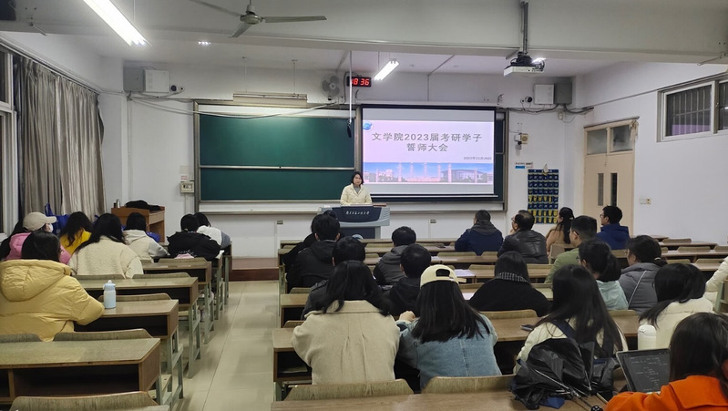 读书不觉“冬”转寒,一寸光阴一寸金,考研初试已越来越近。为鼓舞考研学生士气、坚定学生考研信念、增强备考信心,11月29日晚,文学院在文德楼S608教室召开2023届考研学子誓师大会。文学院院长赵霞、院党委副书记(主持工作)郭雨率全体院领导班子慰问2019级全体考研同学。