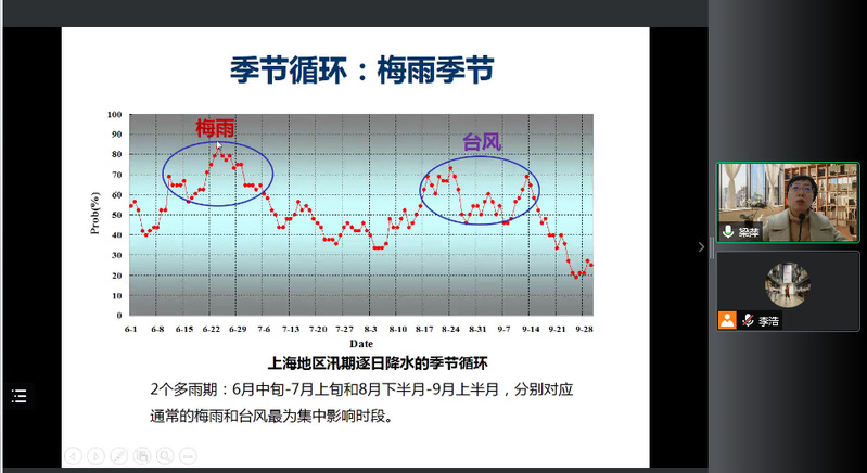 梁萍首先对上海市气象局的历史发展与主要概况作了简要的介绍。然后,从梅雨的定义、不同层面对梅雨研究与预测的需求阐述了梅雨变率及预测的至关重要性。随后,以梅雨的多尺度变率及预测问题为主线,在介绍梅雨气候特征的基础上,揭示其次节气至季节变率和长期变化事实。同时,结合大量的典型梅雨实例、数据和图片,对梅雨的次季节-季节预测进行了分析讲解。最后,梁萍与同学们进行了线上交流互动。
