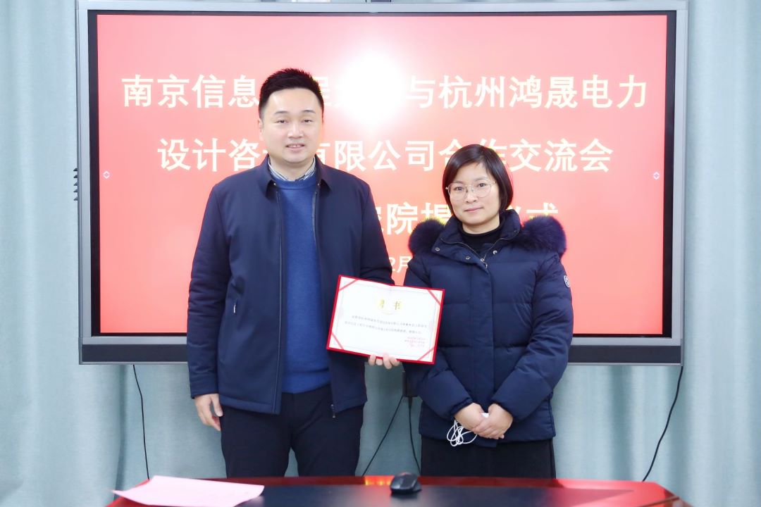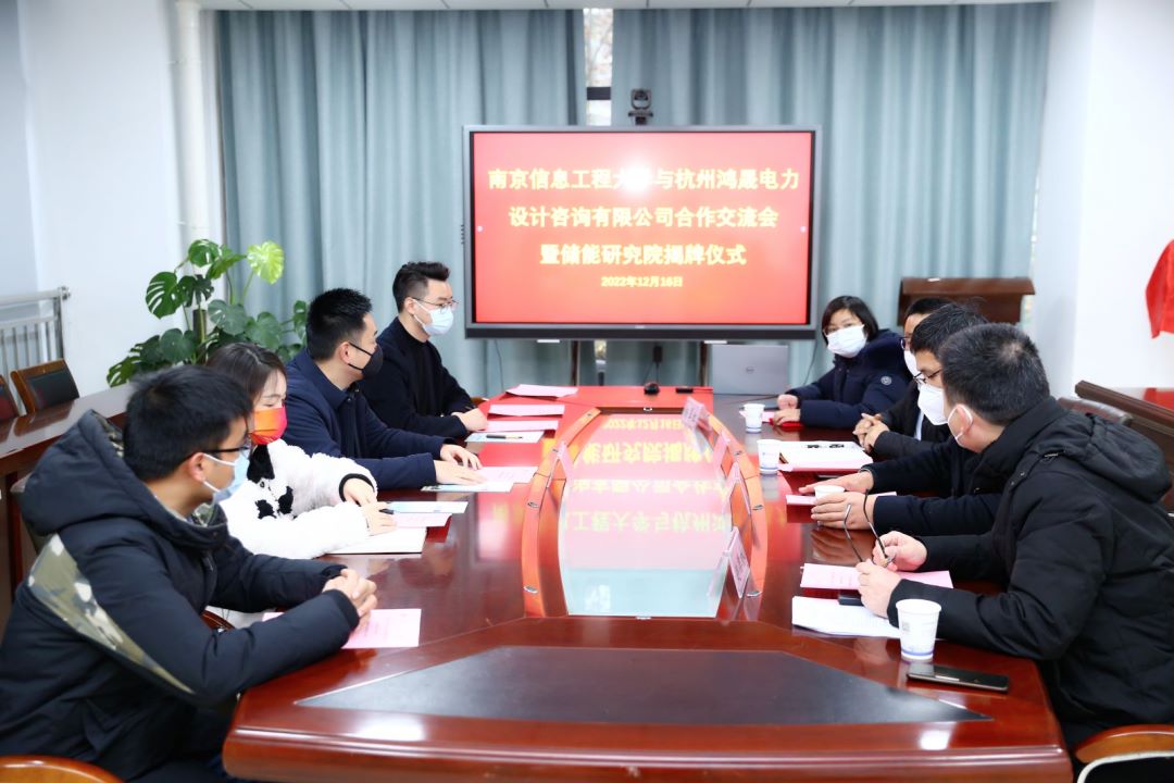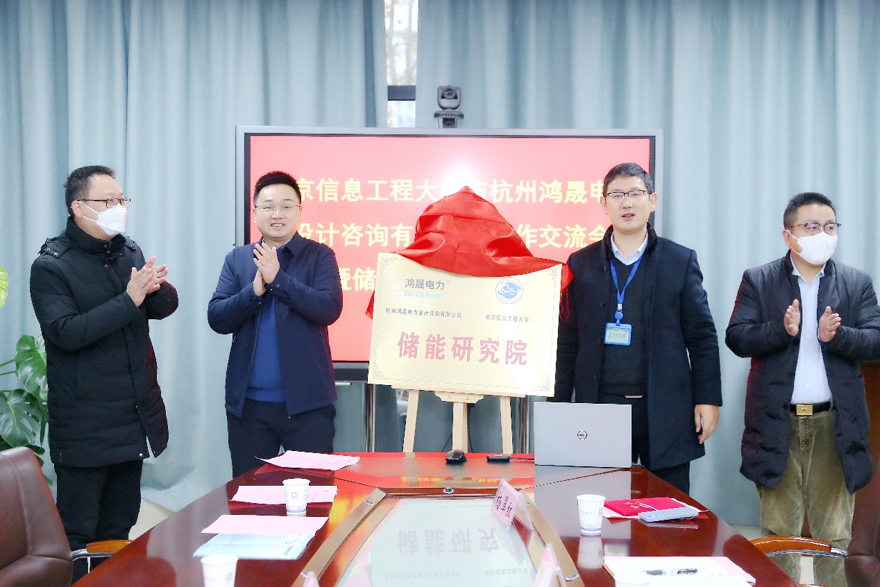 交流会结束后,举行了储能研究院的揭牌仪式。为落实“科教兴国”战略,进一步加强科技交流与合作,建立产业技术创新战略联盟,提升学校服务社会能力,加快科技创新和成果转化步伐,南京信息工程大学与杭州鸿晟电力设计咨询有限公司,在产学研合作基础上,经友好协商,坚持“面向未来、加强合作、优势互补、共同发展”的宗旨,共同搭建产品研发和转化创新平台,共建“南京信息工程大学储能研究院”。院领导和林建林共同为储能研究院揭牌。同时,学院领导授予鸿晟电力公司南京信息工程大学优质就业基地铜牌,并为林建林颁发了特聘教授证书。
