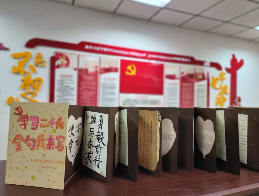 党的二十大召开后,支部第一时间制定专项学习计划,通过集中学习、党员自学和召开专题分享会等形式带动支部同学认真学习党的二十大精神。支部组织全体党员和积极分子诵读二十大报告原文,用声音传递力量;用钢笔、毛笔抄录二十大金句,加深理解,增进感悟;以征文的形式,结合学习体会和生活中的所见、所闻、所感、所悟,表达永远跟党走的心声;组织党员深入宿舍,了解学生需求,结合实际,开展“寝室消音”“期末考试备考答疑”活动,为群众办实事,帮助同学解决实际困难;组织2020级党员和积极分子开展热缩片DIY活动,缓解学习压力,并将制作的作品赠送给2019级参加考研的同学,为他们加油助力。