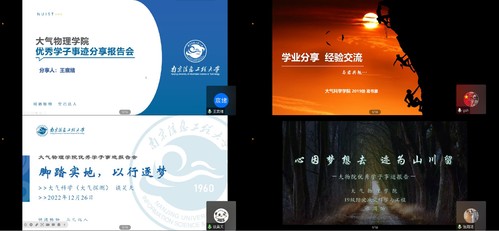 为弘扬优秀学子精神风貌,引导学生奋发向上,砥砺奋进,树立正确的价值观,大气物理学院于12月26日在线上举行优秀学子事迹分享会。本次会议邀请到2022年国家奖学金、校长奖学金获得者王宸绪、葛书豪、谈昊天、张周旸四位同学作为主讲嘉宾分享自己的学习经验和心路历程,大气物理学院2022级本科生全体参加会议,大气物理学院辅导员左泉主持本次分享会。