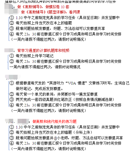 2019级8班利用番茄ToDo软件建立“云端自习室”,督促学生在家学习,便捷而又清晰地了解到同学们在假期中的学习表现。2019级11-17班,在辅导员的指导下选拔优秀学生担当辅导老师,面向学业困难学生统一开设线上辅导班,同学们同步一起学习。2019级22-27班组建寒假“携手同行答疑组”,成为“最强答疑天团”。2020级1-6班制定详细的寒假帮扶计划,帮助需要帮扶的同学结对,利用QQ组群,邀请在相关课程取得较好成绩的同学提供答疑等帮助,同时利用帮扶群进行打卡,提高复习效率。2020级7-9班举办必修课分享会,邀请学习优秀的同学交流、分享学习经验。2020级13-18班制定17天的“一起来寒假冲刺计划”,每班各安排一名答疑志愿者和监督志愿者,辅导员定期选择部分同学进行视频或语音连线,随机抽查同学们的学习状态。