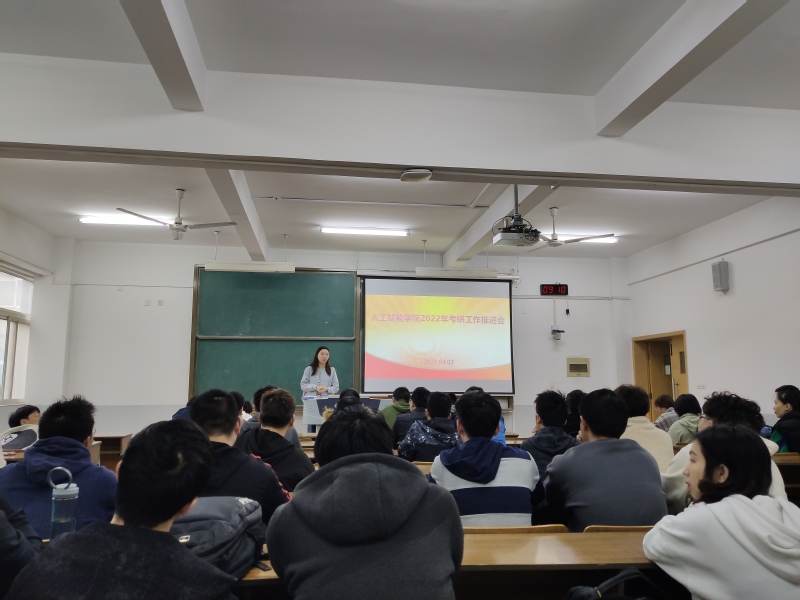 为进一步扎实推进人工智能学院考研工作,4月2日上午,人工智能学院在揽江楼C301召开2022年考研工作推进会。人工智能学院学办副主任曹芸、辅导员代表以及50多名2022届考研学生代表参加会议。